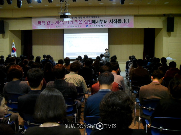 [광주=부자동네타임즈 손권일 기자]광주광역시 서구(청장 임우진)는 지난 11월 11일 2층 대회의실에서 서구청 전 직원을 대상으로 4대폭력(성희롱, 성폭력, 성매매, 가정폭력) 예방교육을 실시했다.