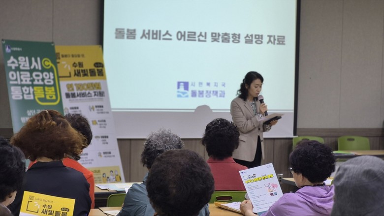 [부자동네타임즈=이의수 기자] 수원특례시(시장 이재준)는 4월 30일까지 경로당과 노인복지관 등 어르신 이용 시설을 중심으로 ‘의료·요양 통합 돌봄 서비스’와 ‘수원새빛돌봄(누구나)’을 집중적으로 홍보한다.