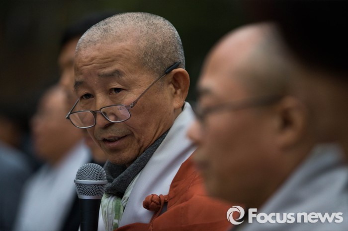 △ 19일 오후 서울 종로구 조계사에서 조계종 화쟁위원회 위원장 도법 스님이 한상균 민주노총 위원장 신변보호 요청에 대한 화쟁위 회의 결과를 발표하고 있다. <사진제공=포커스뉴스> |