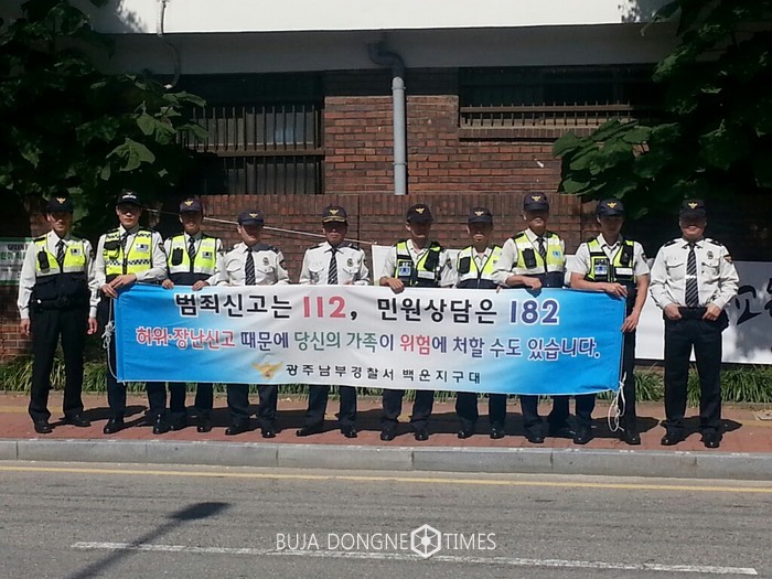 [광주=부자동네타임즈 손권일 기자]광주광역시 남부경찰서 백운지구대(대장 박제철)에서는 2015년 10월 14일 15:00경 남구 월산동 무진중학교 앞 사거리에서 112허위 장난신고는 위험상황에 처한 누군가를 구해야하는 순간을 놓칠 수 있어 피해자는 나와 내 가족이 될 수 있다는 내용의 "112허위장난 신고근절"  캠페인을 펼쳤다.