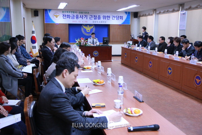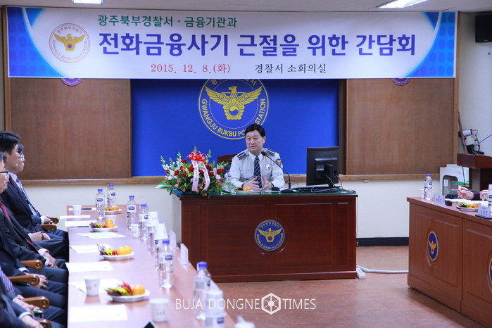 [광주=부자동네타임즈 손권일 기자]광주북부경찰서(총경 김영창)는 '15년12월 8일(火) 10:00에 북부경찰서 2층 소회의실에서, 농협·광주은행·우체국 등 각 금융기관 관계자들이 참석한 가운데 「전화금융사기 근절을 위한 간담회」를 개최하였다.