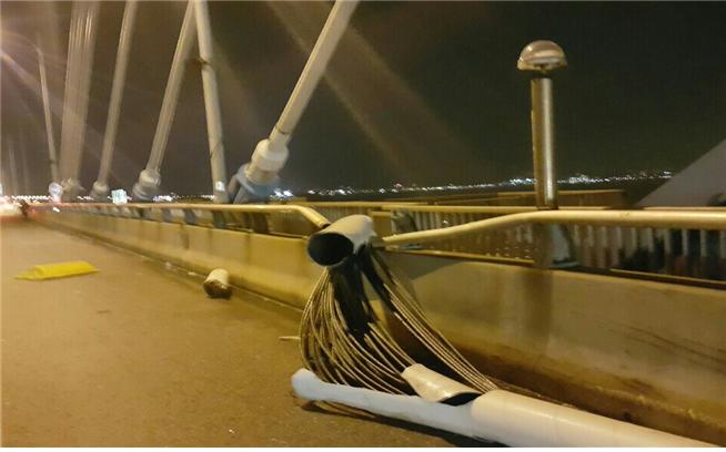 △ 지난 3일 오후 6시 12분쯤 경기 평택시 서해대교 목포방면 행담도휴게소 전방 주탑에 낙뢰로 추정되는 화재로 연결된 케이블이 끊 어지는 사고가 발생해 소방대원들이 화재진압 및 주변 차량 진입을 통제하고 있다. <사진제공=경기도재난안전본부> |
