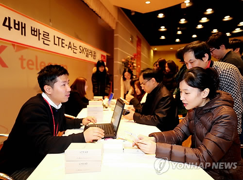 | △ SK텔레콤, '3밴드 LTE-A' 개통 (서울=연합뉴스) 29일 서울 중구 을지로 SK텔레콤 본사에서 열린 '3 band LTE-A' 개통행사에서 고객들이 개통을 기다리고 있다. 2014.12.29 << SKT 제공 >> photo@yna.co.kr |
