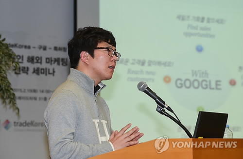 △ '온라인 해외마케팅 전략 세미나' (서울=연합뉴스) 10일 서울 강남구 삼성동 트레이드타워에서 한국무역협회 주최로 열린 '트레이드코리아 온라인 해외 마케팅 전략 세미나'에서 윤성의 구글코리아 차장이 구글을 활용한 수출판로 확대전략에 대해 설명하고 있다. (무협 제공)