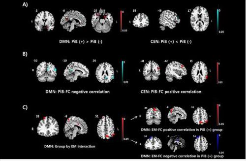 △ A) 아밀로이드 침착 군과 비 침착 군 사이 뇌 기능 신경망의 연결성 차이 DMN 기능 연결성이 침착 군에서 증가되었으며, CEN 연결성은 감소 되어있다. B) 아밀로이드 침착 군 에서 아밀로이드 침착 정도와 기능 신경망 사이의 관계: DMN 기능연결성과 음의 상관관계, CEN과 양의 상관관계가 있음. C) 아밀로이드 침착 군에서 DMN과 피험자의 삽화기억의 상호작용의 모습