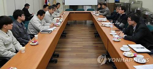 | △ 노동시장 구조개선 특위 사업장 2곳 현장방문 (서울=연합뉴스) 경제사회발전노사정위원회 노동시장 구조개선 특별위원회 전문가 그룹이 11일 린나이 코리아와 원창 금속 등 수도권 소재 사업장 2곳을 방문, 노동시장 구조개선방향에 관한 현장 의견을 청취했다. 전문가 그룹 위원 10명과 노사정위 관계자 등은 특위 논의 의제와 관련해 근로자와 사업주가 체감하는 현장의 문제점과 개선방향에 대한 의견을 청취했다. 사진은 노동시장 구조개선 특별위원회 현장방문 모습. 2015.2.11 << 경제사회발전노사정위원회 제공 >> photo@yna.co.kr |