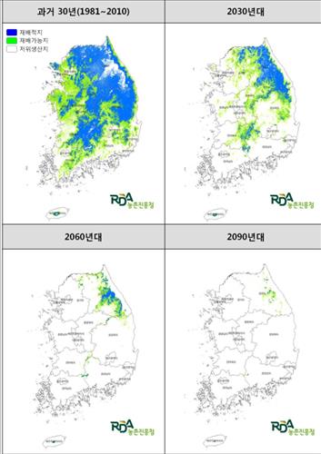 농촌진흥청은 26일 농업용 미래 상세 전자기후도를 바탕으로 제작한 우리 농업 환경에 맞는 작물별 재배지 변동 예측 지도를 토대로 사과와 배 등 우리나라 6대 과수작물의 재배지 변동을 이같이 전망했다.