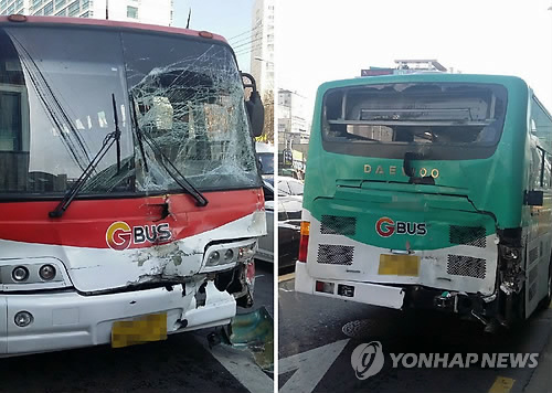 | △ 노원구서 버스와 택시 3중 추돌 (서울=연합뉴스) 이도연 기자 = 27일 오후 서울 노원구 수락산역 앞 도로에서 광역버스와 시내버스 2대가 앞서가던 택시를 추돌하는 사고가 발생, 사고 차량이 부서져 있다. 2015.2.27 dylee@yna.co.kr |