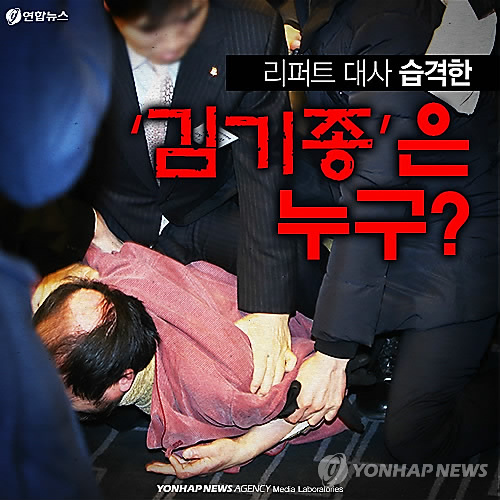 | △ (서울=연합뉴스) 미디어랩 = 마크 리퍼트 미국 대사에게 흉기를 휘두른 우리마당독도지킴이 김기종(55) 대표는 과거 일본 대사에게도 시멘트 덩어리를 던져 처벌을 받은 전력이 있는 것으로 드러났다. 이미지 |