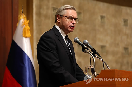 | △ 축사하는 티모닌 주한러시아대사 (서울=연합뉴스) 신준희 기자 = 6일 오전 서울 소공동 롯데호텔에서 '한러수교 25주년, 평가와 과제'를 주제로 열린 한러수교 25주년 기념 한러대화 정경컨퍼런스에서 티모닌 주한러시아대사가 축사를 하고 있다. 2015.3.6 hama@yna.co.kr |