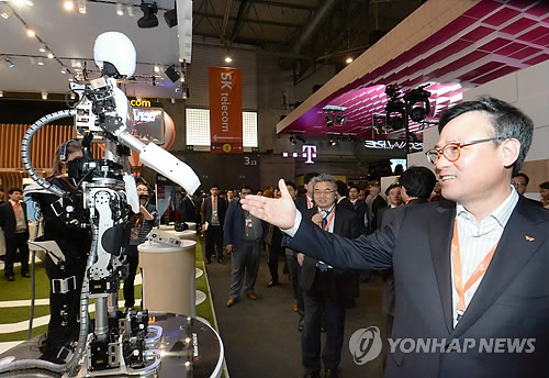 △ SK텔레콤 장동현사장이 2일 오후(한국시간) 스페인 바르셀로나에서 열리는 '모바일 월드 콩그레스 (MWC) 2015 전시장 내 SK텔레콤 부스에서 5G 로봇과 악수 하고 있다.