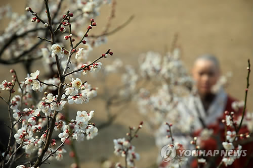 | △ 봄 향기 가득한 사찰 (제주=연합뉴스) 고성식 기자 = 매화로 유명한 제주시 오라동 월정사 앞마당에서 13일 좌선 수행에 몰두하던 비구니가 활짝 핀 매화를 바라보며 따뜻한 봄을 느끼고 있다. 2015.3.13. koss@yna.co.kr |