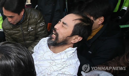 | △ 마크 리퍼트 주한 미국대사를 흉기로 습격한 김기종 씨가 14일 서울 송파구 가락동 경찰병원에서 퇴원, 경찰 호송차량에 올라 검찰로 향하고 있다. |