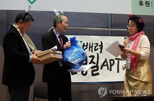 △ '배려 통해 사회갈등 해결' 배려문화포럼 창립 (서울=연합뉴스) 김주성 기자 = 20일 오후 서울 중구 프레스센터에서 열린 배려문화포럼 선포식에서 고문을 맡은 장석춘 전 한국노총위원장(왼쪽부터), 장기표 신문명정책연구원장과 운영위원을 맡은 김윤경 환경강사가 배려문화가 절실한 아파트 경비원과 주민의 관계를 다룬 연극을 선보이고 있다.