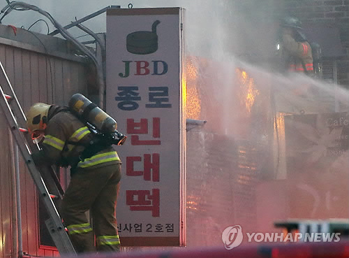 | △ 화재 진화하는 소방대원 (서울=연합뉴스) 이지은 기자 = 23일 오후 서울 종로구 세종문화회관 인근 식당가에서 화재가 발생해 소방대원들이 진화작업을 하고 있다. |