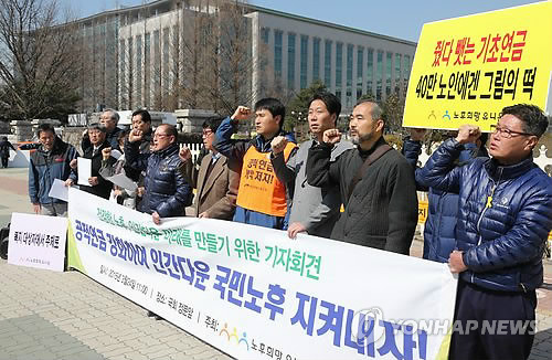 | △ 노후연금 보장 촉구 기자회견 (서울=연합뉴스) 백승렬 기자 = 노후희망유니온 회원들이 24일 국회 정문 앞에서 노후연금 보장을 촉구하는 기자회견을 하고 있다. 2015.3.24 srbaek@yna.co.kr |