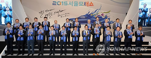 △ 윤상직 산업통상자원부 장관(앞줄 가운데) 등 참석 내빈들이 3일 경기도 고양시 킨텍스에서 열린 2015 서울 모터쇼 개막식에서 기념촬영하고 있다.