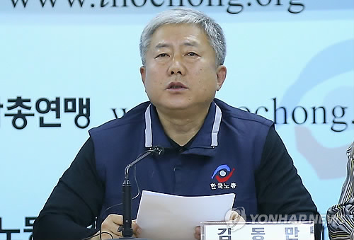 | △ 한노총, 노사정대화 결렬 선언 (서울=연합뉴스) 김도훈 기자 = 한국노총 김동만 위원장이 8일 오후 서울 여의도 한국노총회관에서 중앙집행위원회를 마친 뒤 기자회견을 하고 있다. 이날 한국노총은 노동시장 구조개선을 위한 노사정 협상의 결렬을 선언했다. superdoo82@yna.co.kr |