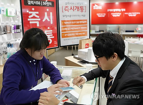 | △ SKT, '갤럭시 S6-엣지' 출시 (서울=연합뉴스) SK텔레콤이 삼성전자 스마트폰 '갤럭시S6', '갤럭시 S6 Edge(엣지)'를 10일 출시한 가운데 서울 명동에 위치한 SK텔레콤 대리점에서 한 예약가입자가 갤럭시 S6 단말기를 구매하고 있다.(SK텔레콤 제공) |