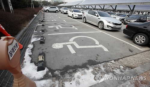| △ 차량들이 장애인용 주차공간을 가로막아 눈살을 찌푸리게 하고 있다. (연합뉴스 자료사진) |