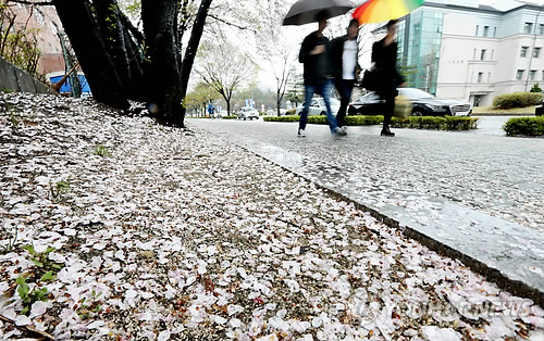 | △ 비가 내린 벚꽃이 바닥에 떨어져 뒤덮여 있다. (연합뉴스 자료사진) |