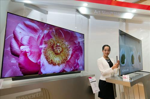 | △ 15일 중국 베이징에서 열린 LG디스플레이의 '아트슬림 프로모션'행사에서 도우미가 전시된 아트슬림 TV와 스마트폰 두께를 비교하고 있다. |