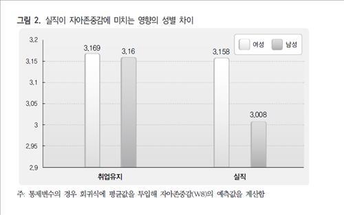 논문은 한국복지패널 7차 자료와 8차 자료를 사용해 7차년도 취업자 중에 8차년도에 실직을 경험한 사람 5천387명의 자존감이 어떻게 변했는지, 실직의 영향이 성별에 따라 차이가 있는지를 분석했다.