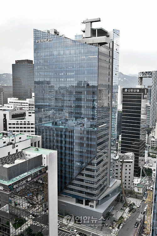 | △ 동국제강 신사옥 '페럼타워' (서울=연합뉴스) 동국제강은 16일 을지로 신사옥 ‘페럼타워(Ferrum Tower)’에 입주, 본사를 이전했다. 사진은‘페럼타워’전경. 2010.8.16 << 동국제강 >> photo@yna.co.kr |