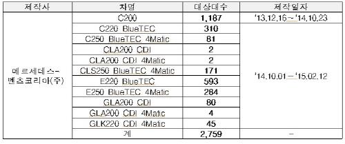 리콜대상은 2013년 12월16일부터 2014년 10월23일까지 제작된 C200 승용차 1천187대, 2014년 10월1일부터 2015년 2월12일까지 제작된 E220 승용차 등 10개 차종 1천572대이다.