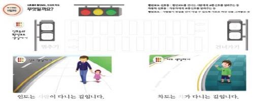 교재 내용은 만 3∼5세 어린이 눈높이에 맞춰 횡단보도 건너는 법과 교통수단 이용법 등을 스티커 붙이기, 색칠하기, 선긋기 등을 통해 배우도록 구성했다.