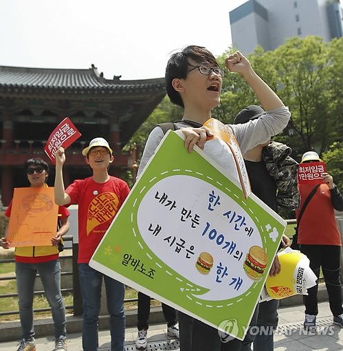 △ 구호 외치는 알바노조 (서울=연합뉴스) 이승민 기자 = 근로자의 날인 1일 서울 종로 보신각 앞에서 열린 아르바이트 노동자 처우 개선을 위한 '알바 데이' 행사에서 참석자들이 구호를 외치고 있다. 2015.5.1 logos@yna.co.kr |