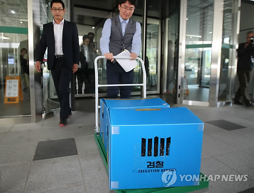 △ 검찰, 한국석유공사 본사 압수수색 (울산=연합뉴스) 김용태 기자 = 검찰이 한국석유공사를 전격 압수수색한 12일 오후 울산시 중구 우정동 한국석유공사 본사에서 검찰 관계자들이 압수품이 든 상자를 가지고 나오고 있다. |