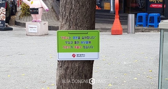 이에 광주 서구(구청장 임우진)에서는 가로수가 훼손되어 도시미관을 해치는 것을 예방하기 위해 상가 주변 가로수에 수목 보호 안내표지판 40개을 설치하고 홍보활동을 통해 쾌적한 가로 경관이 제공될 수 있도록 노력하고 있다.