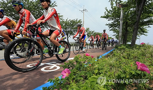 △ (양양=연합뉴스) 이종건 기자 = 강원도 고성 통일전망대에서 부산 을숙도를 연결하는 총연장 720㎞의 동해안 자전거길 가운데 강원도 구간(고성∼삼척) 242㎞가 개통된 9일 동호인과 사이클 선수들이 페달을 밟고 있다. 2015.5.9 momo@yna.co.kr |