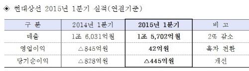 (서울=연합뉴스) 성혜미 기자 = 현대상선[011200]은 연결재무제표 기준 올해 1분기 매출액 1조5천702억원, 영업이익 42억원, 당기순손실 445억원을 기록했다고 15일 공시했다.