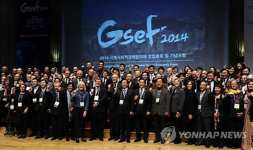 △ 국제사회적경제협의체 창립총회 및 기념포럼 (서울=연합뉴스) 이지은 기자 = 18일 오전 서울시청 다목적홀에서 열린 '2014 국제사회적경제협의체 창립총회와 기념포럼' 개막식에서 박원순 서울시장과 참석자들이 기념촬영을 하고 있다. 세계 60개 도시와 국제기구들이 참여하는 국제사회적경제협의체(GSEF)는 각국 도시와 민간기관이 모여 사회적경제 비전과 경험을 공유하고 다양한 도시문제의 해법을 마련하기 위한 조직이다. 2014.11.18 << 서울시 제공 >> photo@yna.co.kr |