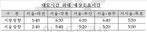 도로공사는 토요일 서울 출발 기준으로 대전까지 3시간40분, 강릉 6시간30분, 부산 6시간30분, 광주 6시간40분, 목포 5시간50분이 최대 소요시간이 될 것으로 전망했다.