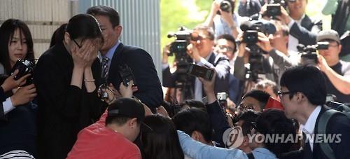 △ 얼굴 가린 조현아 전 대한항공 부사장 (서울=연합뉴스) 박동주 기자 = '땅콩회항' 사건으로 서울 서초동 서울고법에서 열린 항소심에서 징역 10월에 집행유예 2년을 선고받은 조현아 전 대한항공 부사장이 22일 법원을 나오던 중 취재진을 보고 두 손으로 얼굴을 가리고 있다. 2015.5.22 |