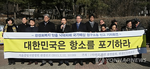 △ 한국한센총연합회와 한센인권변호단 관계자들이 서울 서초동 서울지방법원 앞에서 한센 회복자들에 대한 강제 '낙태'·'단종'에 따른 국가배상 청구소송의 1심 선고에 관한 기자회견을 하고 있다.(연합뉴스 자료사진)