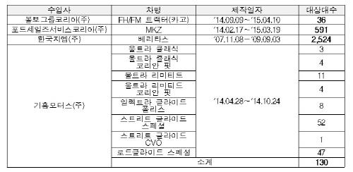 볼보FH/FM 화물자동차(2014년 9월9일∼2015년 4월10일) 36대, 포드MKZ(2014년 2월17일∼2015년 3월19일) 591대, 한국지엠 베리타스(2007년 11월8일∼2009년 9월3일) 2천524대도 리콜된다.