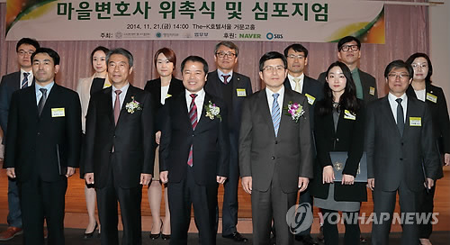 △ 지난해 11월 서울 서초구 The-K 서울호텔에서 열린 '마을변호사 위촉식 및 심포지엄'에서 참석자들이 마을변호사 위촉장 수여자들과 함께 기념촬영하고 있다. (연합뉴스 자료사진) |
