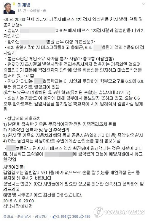 | △ '메르스 정보 공개' 이재명 성남시장 페이스북 (성남=연합뉴스) 이재명 성남시장이 메르스 양성 판정을 받은 사람의 직업과 거주지, 자녀가 다니는 학교 실명을 6일 공개했다. 이 시장은 이날 오후 8시 10분께 자신의 페이스북에 메르스 사태와 관련한 성남시 조치 내용을 알리는 '<6.6 20:00 현재 성남시 거주자 메르스 1차 검사 양성반응 환자 발생..현황 및 조치내용>'이라는 글을 올렸다. 사진은 페이스북 캡쳐. 실명은 보도과정 중 익명처리. 2015.6.6 << 이재명 성남시장 페이스북 캡쳐 >> you@yna.co.kr |