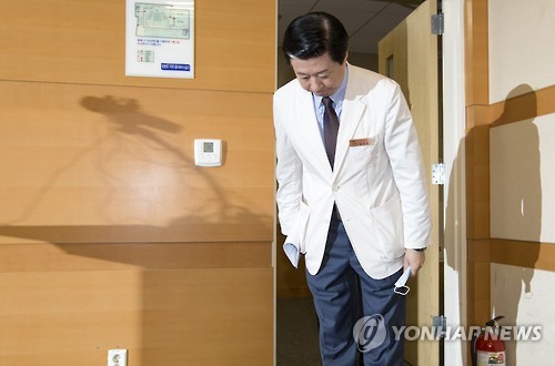 △ 인사하는 송재훈 병원장 (서울=연합뉴스) 윤동진 기자 = 송재훈 삼성서울병원 병원장이 14일 오전 서울 강남구 서울삼성병원 암병원에서 열린 기자회견장에 들어서며 인사를 하고 있다. 송 원장은 이날 기자회견에서 "이날부터 신규 외래·입원 환자를 한시적으로 제한하며 응급수술을 제외하고는 수술과 응급진료도 한시 중단한다"고 밝혔다. 2015.6.14 mon@yna.co.kr