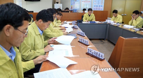 | △ 농식품부, 가뭄·수급안정 대책 점검회의 (세종=연합뉴스) 여인홍 농림축산식품부 차관이 14일 오후 정부세종청사 농식품부 상황실에서 농촌진흥청, 농협, 농어촌공사, 농수산물유통공사 등 유관기관장들과 함께 가뭄상황을 점검하고 가뭄 장기화에 대비한 비상 급수 및 농산물 수급 대책 등을 점검하고 있다. 2015.6.14 << 농림축산식품부 제공 >> scoop@yna.co.kr |