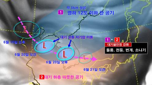 특히 20일에는 대기 불안정이 심화돼 국지적으로 강한 돌풍과 천둥, 번개를 동반한 비가 오는 곳이 있을 전망이다.