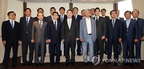 △ 기념촬영하는 회장단 (서울=연합뉴스) 박동주 기자 = 22일 오전 서울 롯데호텔에서 열린 대한·서울 상공회의소 회장단 긴급간담회에 앞서 박용만 대한상의 회장(앞줄 가운데) 등 참석자들이 기념촬영을 하고 있다. pdj6635@yna.co.kr