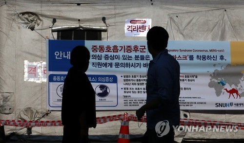 | △ '메르스 걱정' (서울=연합뉴스) 서명곤 기자 = 중동호흡기증후군(메르스)로 인한 사망자가 2명이나 발생했다. 또 환자수는 6명이나 늘어 25명이 됐으며 새로 추가된 환자 중에서는 3차 감염자도 나왔다. 사진은 2일 오전 종로구 서울대학교병원 응급실 입구에 설치된 메르스 의심환자 격리센터(의심증상 검사 및 임시 수용시설) 앞에서 시민들이 안내문을 바라보는 모습. 2015.6.2 seephoto@yna.co.kr |