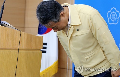 △ 정종섭 장관 사과 행정자치부 소속 지방행정연수원이 운영하는 '중견리더과정' 교육생들이 중국 지린(吉林)성 지안(集安)에서 역사문화탐방 중 버스 추락사고를 당한것과 관련해 정종섭 행정자치부장관이 2일 오전 정부서울청사에서 열린 브리핑에서 고개숙여 사과하고 있다. |