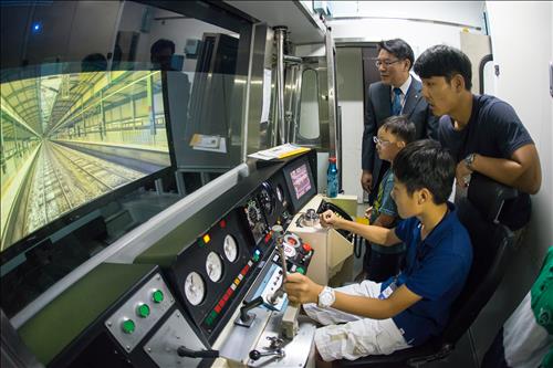 △ 모의운전연습기를 체험해보는 모습<<서울메트로 제공>>