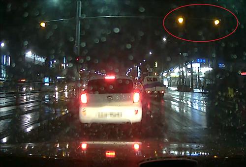 △ (서울=연합뉴스) 서울 강서경찰서는 교통법규를 위반하는 차량만 골라 고의로 사고를 내 보험금을 가로챈 혐의(상습사기)로 김모(41)씨를 구속했다고 2일 밝혔다. 사진은 김씨(앞차)가 황색신호가 들어오는 순간 속도를 높히다가 급정거를 하며 사고를 유발하기 직전의 모습. 2015.7.2 << 서울 강서경찰서 제공 >>